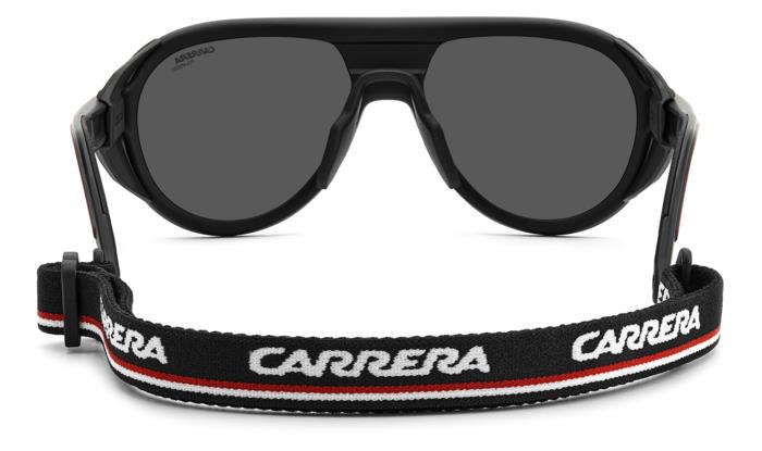 Occhiale da sole Carrera nero e rosso con protezioni laterali magnetiche.