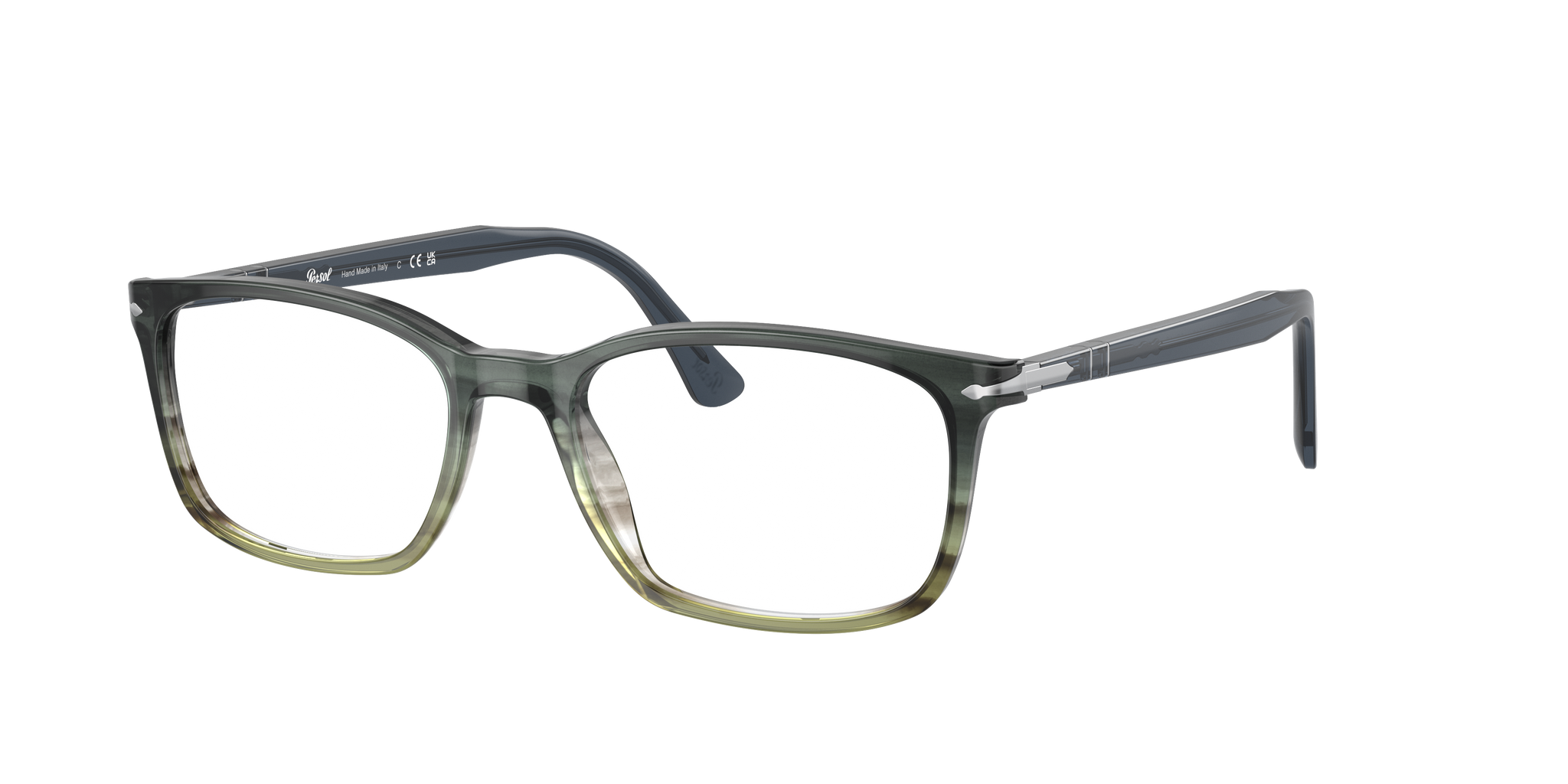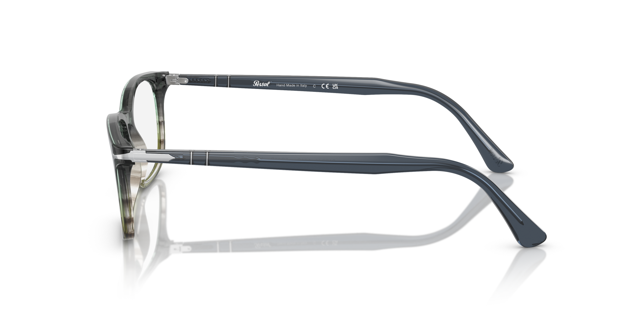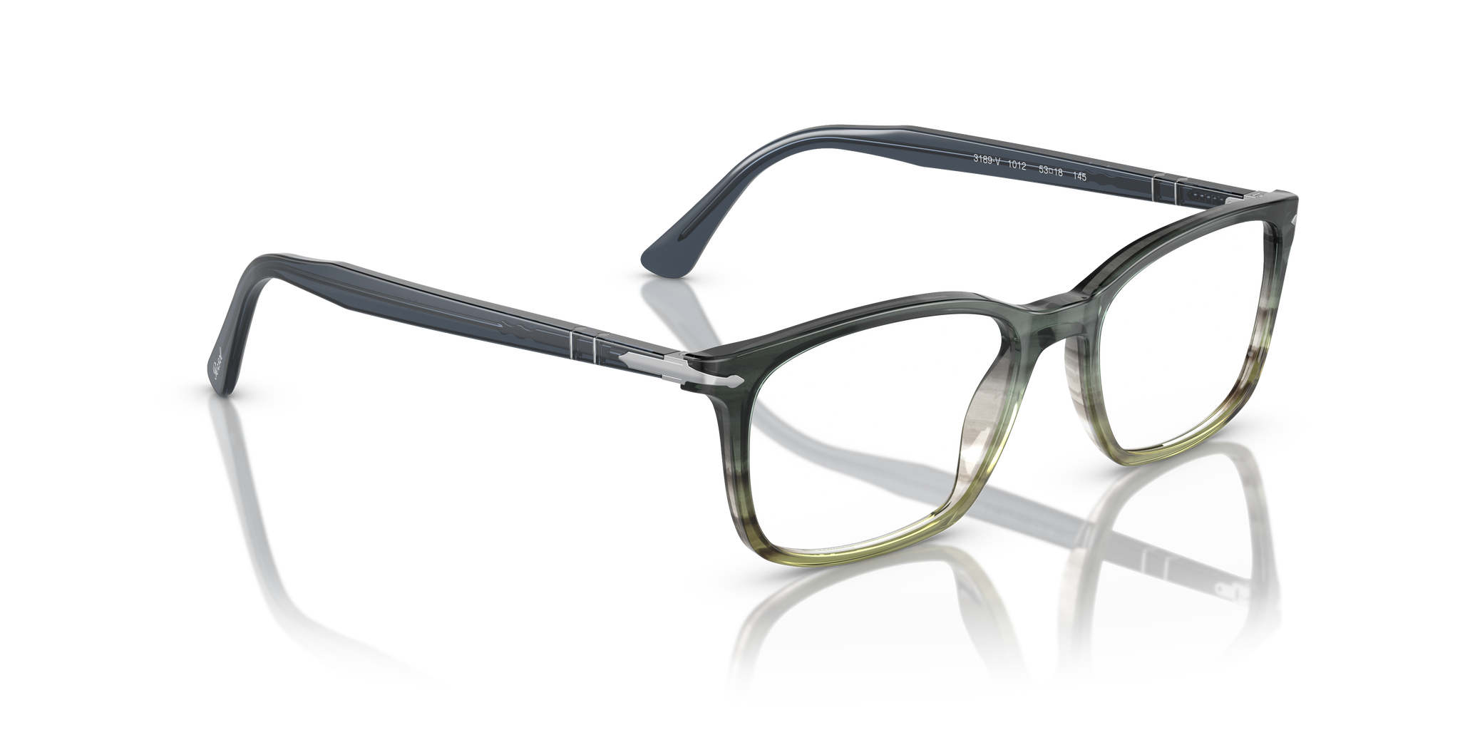 Occhiale da vista Persol in acetato striato grigio verde sfumato.