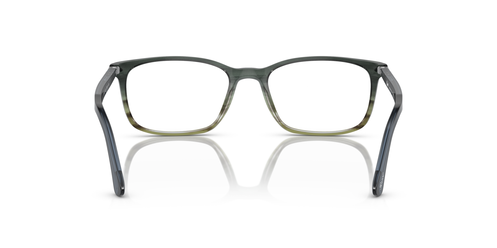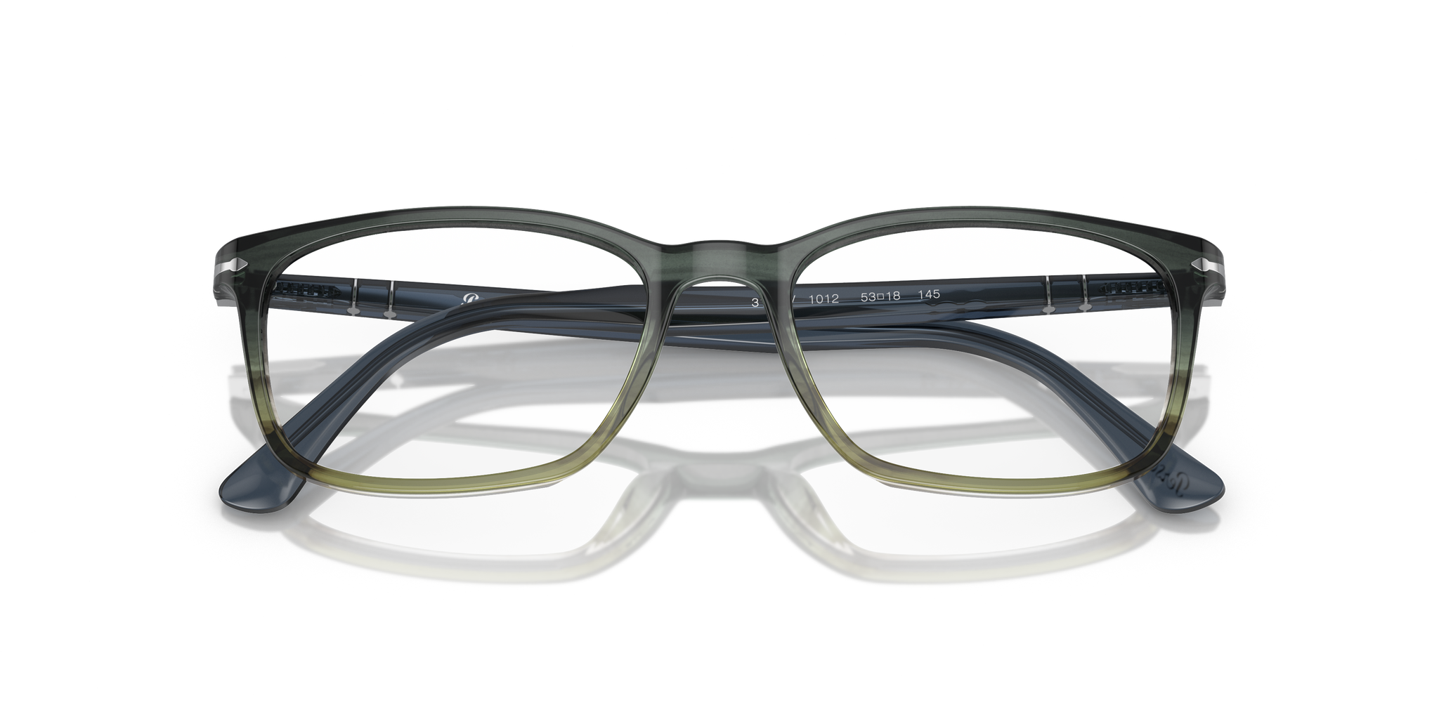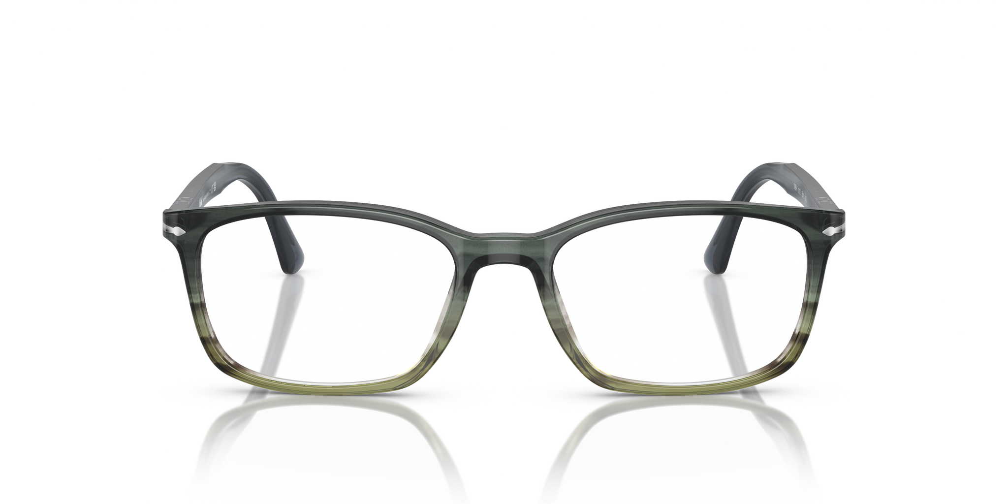 Occhiale da vista Persol in acetato striato grigio verde sfumato.